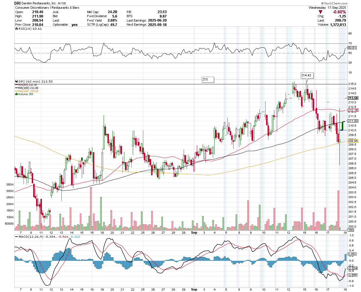 DRI was trading at $213.50 pre-market. Support is at $212.16, while the potential upside levels stand at $214.42 and $215.