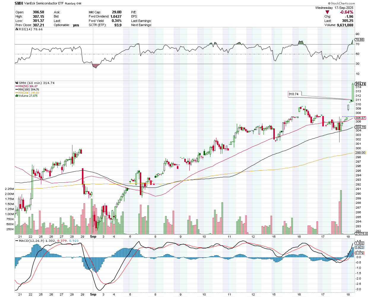 SMH traded at $314.74 pre-market. Support lies at $310.74; a bounce could test $317 and $319.