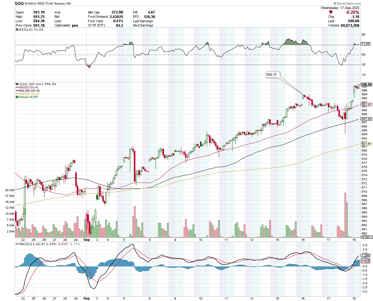 QQQ was trading at $596.50 pre-market, with key support at $593.75. Holding above this level keeps upside targets in play at $598 and $600.