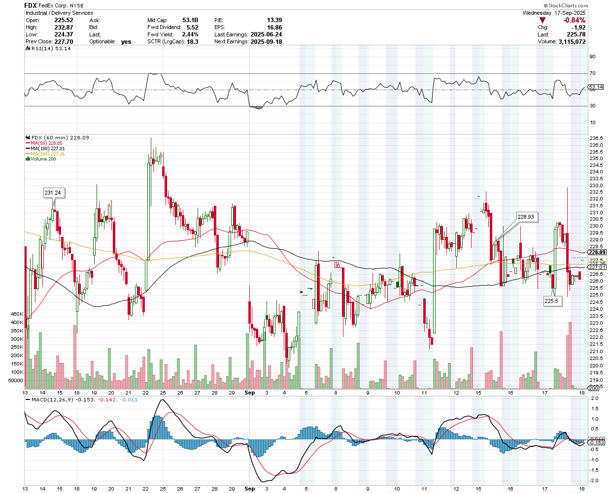 FDX was trading at $228.09 pre-market. Support is at $225.50, while the potential upside levels stand at $228.93 and $231.24.