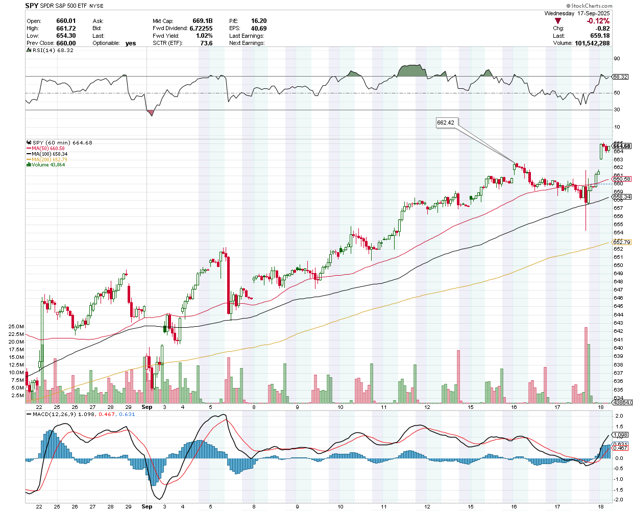 SPY was trading at $664.68 pre-market, with support at $662.42 and potential upside targets at $666 and $667.